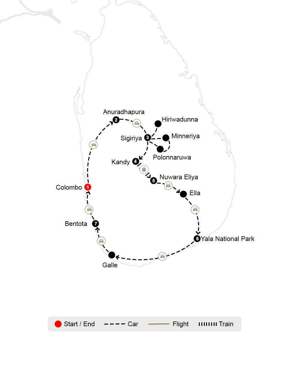 Embark on a mesmerising 14-day group tour through Sri Lanka, starting in the dynamic capital of Colombo, where you'll explore vibrant markets, historic temples, and colonial architecture. Travel to the ancient city of Anuradhapura to witness its sacred stupas and rich history. Ascend the awe-inspiring Sigiriya Rock Fortress for panoramic views and delve into the rustic charm of Hiriwadunna village, experiencing traditional Sri Lankan life. Discover the ancient ruins of Polonnaruwa and encounter elephants at Minneriya National Park. Marvel at the Dambulla Cave Temples before immersing yourself in Kandy's cultural heritage and the revered Temple of the Tooth. Enjoy a scenic train ride through lush tea plantations to Nuwara Eliya, an adventurous hike up Little Adam’s Peak, a visit to the iconic 9 Arch Bridge, and the cascading Ravana Falls in Ella. Experience thrilling wildlife safaris in Yala National Park and explore the colonial charm of Galle. End your journey with a relaxing stay on the pristine beaches of Bentota/Beruwala, leaving you refreshed and inspired by the diverse beauty and rich heritage of Sri Lanka.