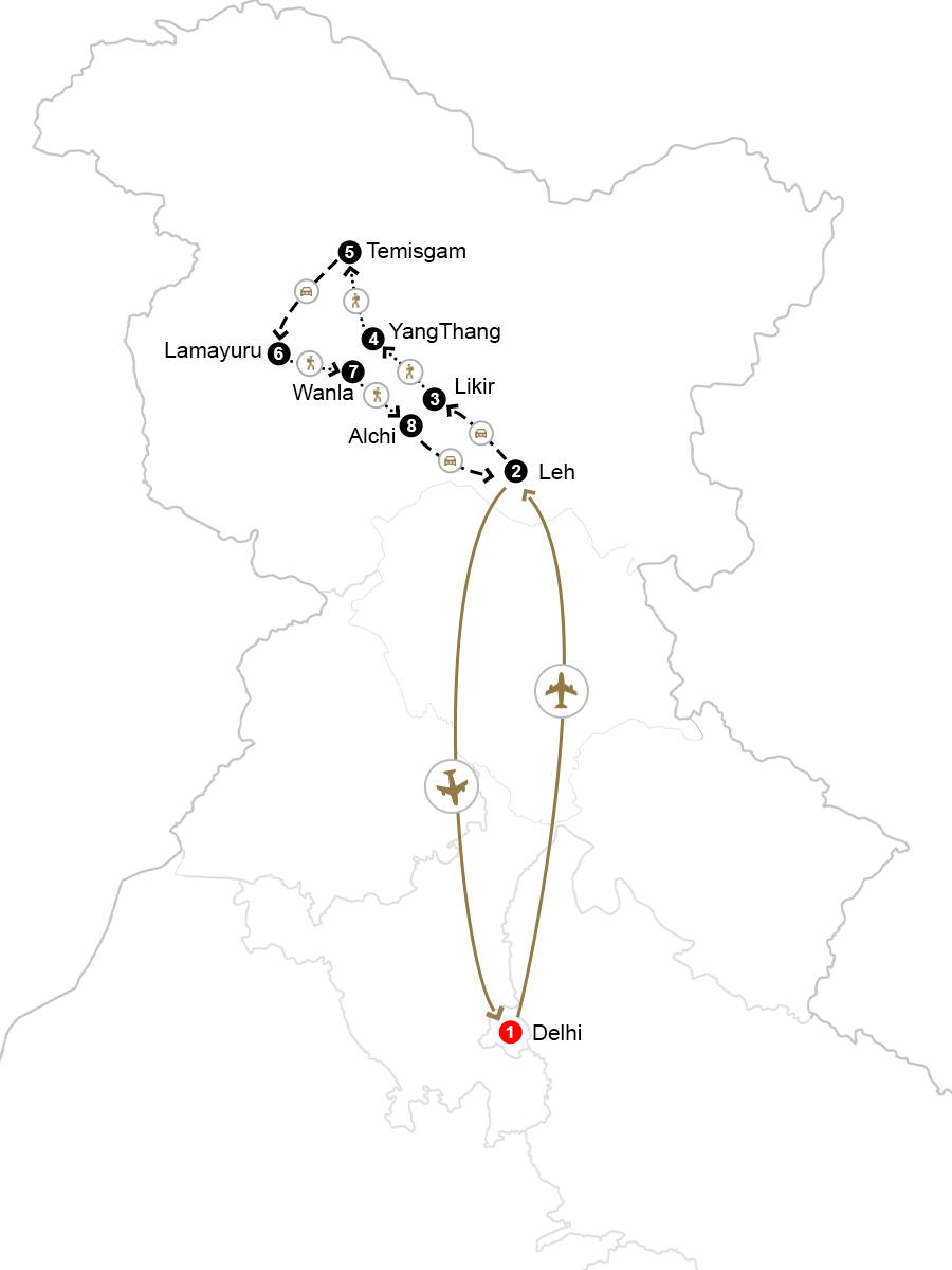 Embark on an unforgettable journey through the heart of the Indian Himalayas, blending cultural exploration with trekking adventures in Ladakh. Begin your trip in Delhi, the vibrant capital, before flying to Leh, the gateway to Ladakh. Acclimatize while discovering ancient monasteries, bustling markets, and stunning landscapes. Venture on a scenic trek through Ladakh’s remote villages, starting from Likir to Yangthang, where you’ll witness traditional Ladakhi life and awe-inspiring Himalayan vistas. Continue trekking from Yangthang to Temisgam, experiencing the serene beauty of the Indus Valley. A drive to Lamayuru Monastery, known for its surreal "Moonland" terrain, sets the stage for another short trek to Wanla, before heading to Alchi Monastery, famed for its ancient murals. Throughout the journey, immerse yourself in Ladakh’s rich Buddhist culture, visit historic monasteries, and witness breathtaking landscapes of snow-capped peaks, deep valleys, and picturesque villages. Conclude your adventure with a scenic flight back to Delhi, carrying memories of Ladakh’s rugged beauty and spiritual serenity. This tour is perfect for adventure seekers and cultural explorers looking to experience Ladakh’s untouched beauty, remote trails, and centuries-old monasteries.