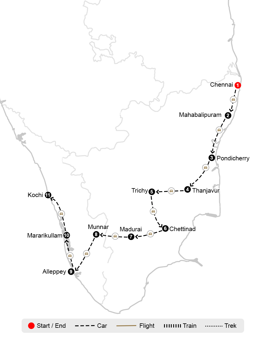 Sightseeing with an English-speaking local guide in Mahabalipuram, Pondicherry, Thanjavur, Chettinadu, Madurai, Munnar and Kochi.