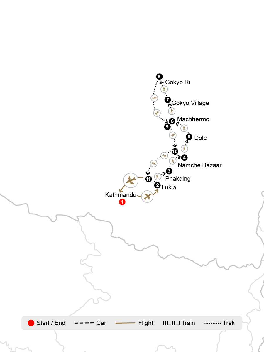 Kathmandu (3) | Phakding (1) | Namche Bazaar (2) | Dole (1) | Machhermo (1) | Gokyo Village (1) | Machhermo (1) | Namche Bazaar (1) | Lukla (1) | Kathmandu (2)