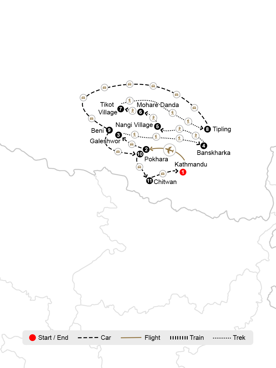Kathmandu (3) | Pokhara (1) | Banskharka (1) | Nangi Village (1) | Mohare Danda (1) | Tikot Village (1) | Pokhara (2) | Chitwan (2) | Kathmandu (1)