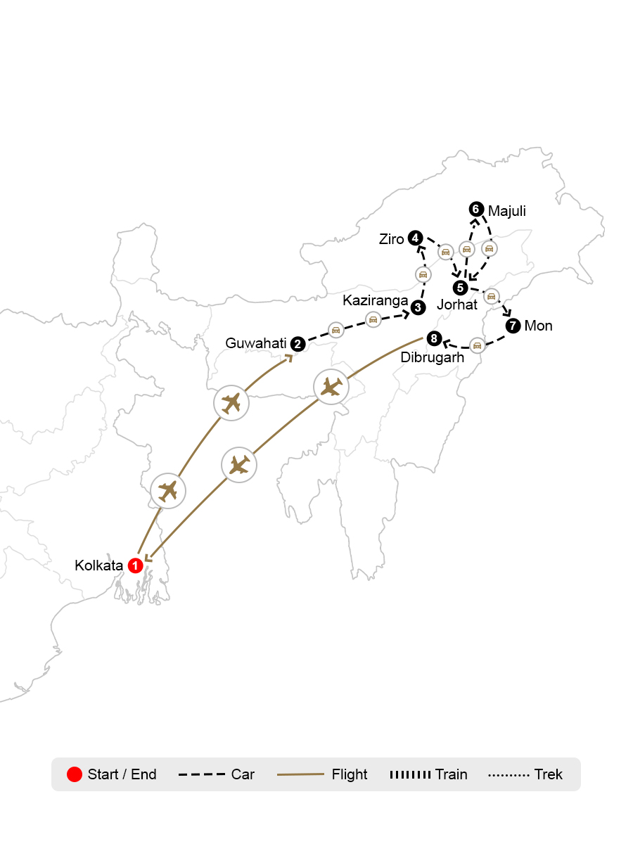 Delhi, Kaziranga, Ziro, Jorhat, Mon, Dibrugarh