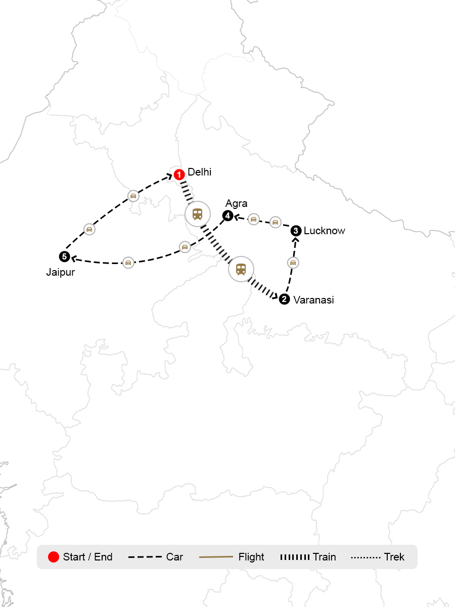 Embark on an 11-day journey through North India, where history, spirituality, and culture come alive. Begin in Delhi, exploring the contrasts of Old and New — from Mughal forts and colonial boulevards to bustling markets and modern city life. A scenic train takes you to Varanasi, the spiritual heart of India, where you’ll witness the mystical Ganga Aarti, glide past ancient ghats at sunrise, and wander the winding lanes steeped in tradition. From there, travel to Lucknow, the city of Nawabs, and experience its poetic charm through grand Mughal architecture, serene gardens, and the rich flavors of Awadhi cuisine. En route to Agra, visit Kannauj, the ancient perfume capital, and explore the art of traditional attar-making. In Agra, marvel at the timeless Taj Mahal and the impressive Mughal forts and palaces. Continue to Jaipur, the Pink City, where royal forts, colorful bazaars, and Rajput history await. Conclude your journey back in Delhi, carrying with you the sights, sounds, and soul of India — a tapestry of devotion, grandeur, and unforgettable experiences.