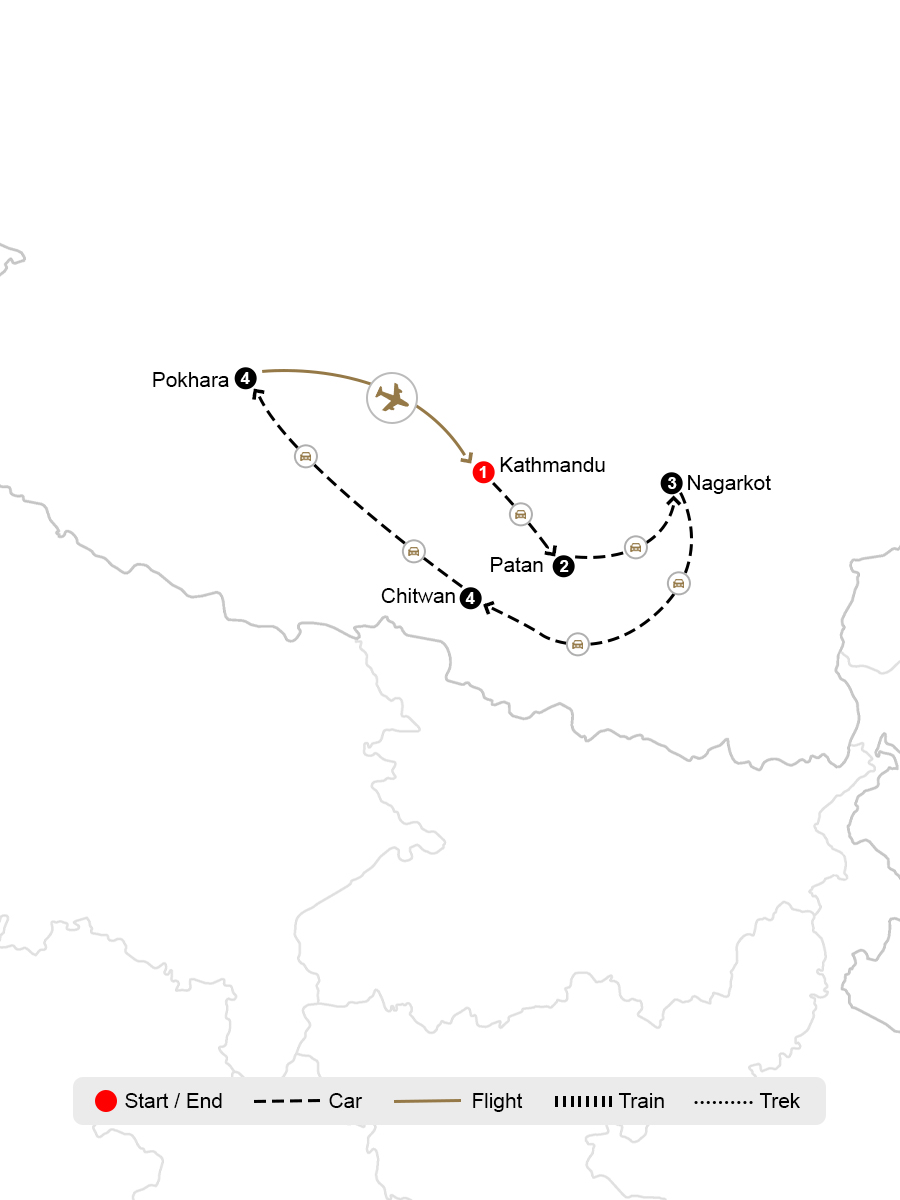 Kathmandu (3) | Nagarkot (2) | Chitwan (2) | Pokhara (2) | Kathmandu (1)