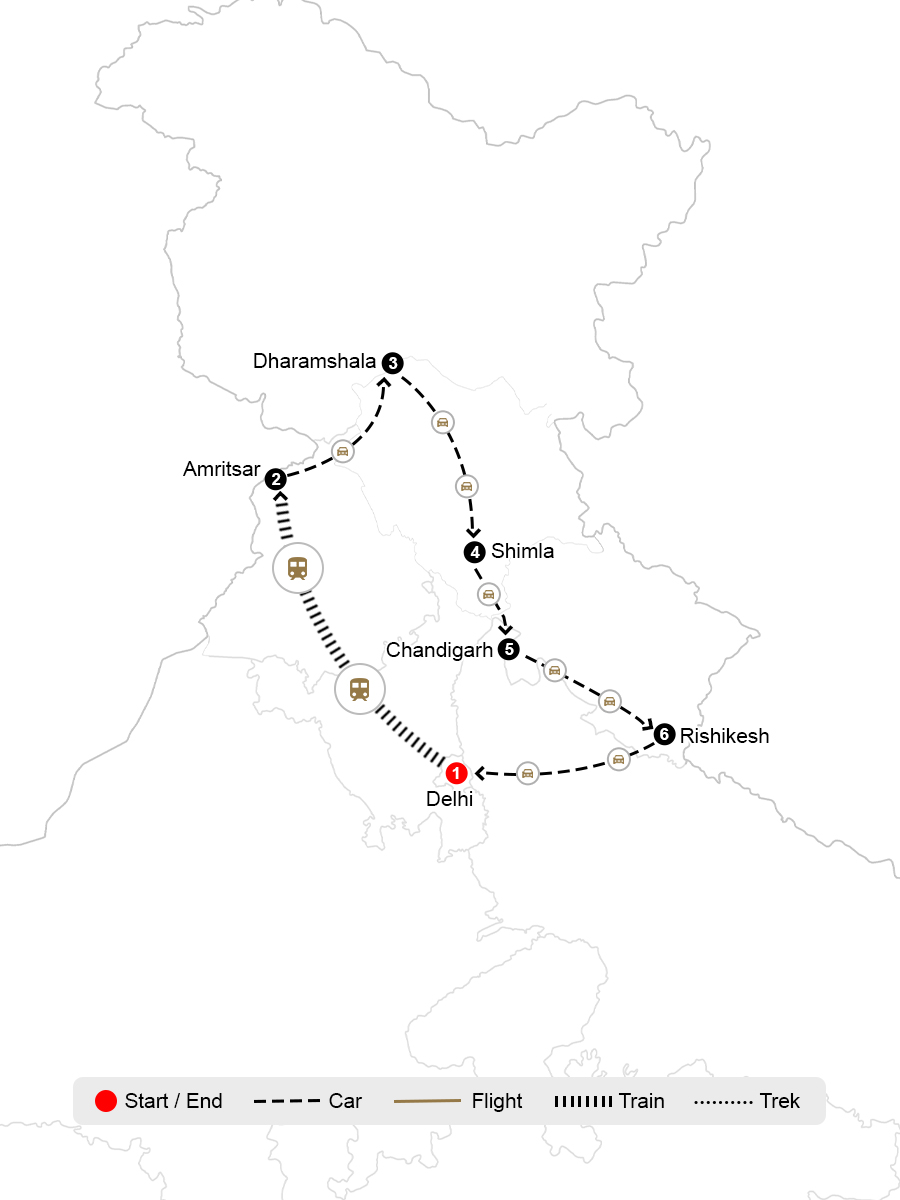 Sightseeing with an English-speaking local guide in Delhi, Amritsar, Dharamshala, Shimla, Chandigarh, and Rishikesh.