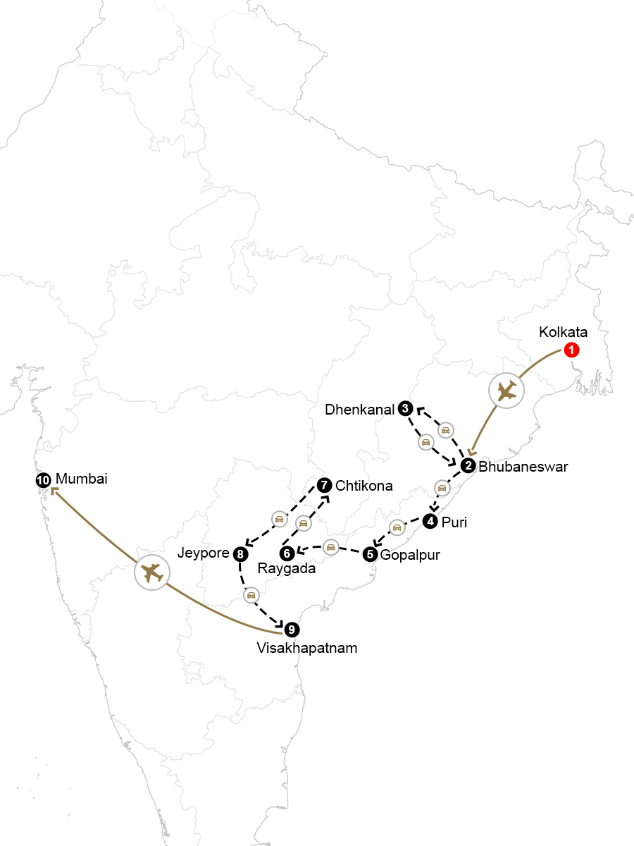 After breakfast, check out (standard check-out time 1200 hrs. noon) from your hotel and bid farewell to the tribal heartland of Odisha and the lush Eastern Ghats. transfer to Visakhapatnam Airport to board your flight to Mumbai. On arrival at Mumbai Airport, you will be met and assisted with your transfer to the International Terminal to connect with your onward flight back home. Depart with cherished memories of India’s indigenous cultures, vibrant weekly markets, sacred temples, and remote highland communities.